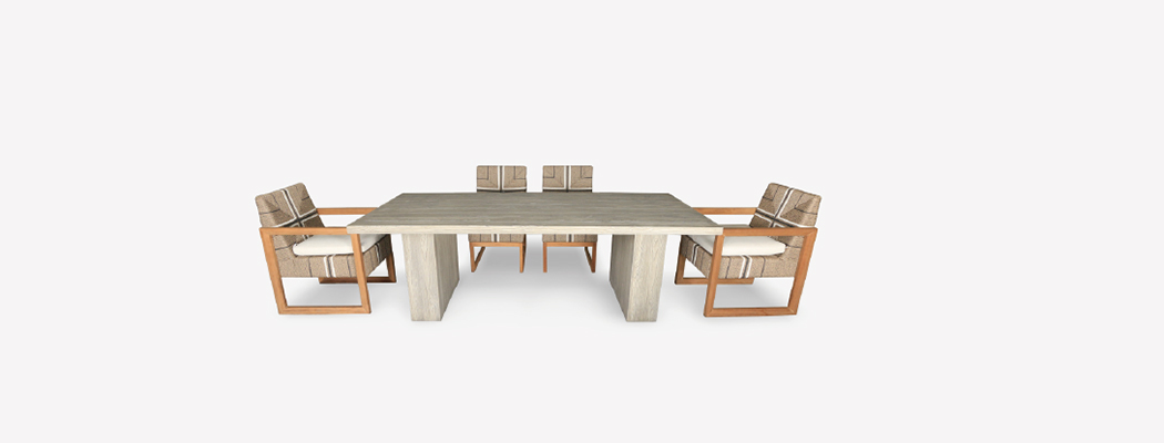 田园、现代设计风格,个性化设计,特斯林绳餐椅搭配仿木纹水泥桌赋予了户外家具诗般的美妙和诱惑。